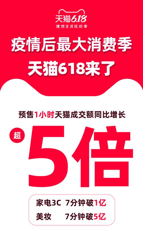 25日,天貓公布天貓618正式開始1小時數(shù)據(jù)顯示,預售成交額同比增長達到515%。其中,消費電子、家裝等行業(yè)率先實現(xiàn)7分鐘破1億,美妝7分鐘超5億。 上半年最大的報復性消費來了!全國人積蓄了半年的洪荒之力,在天貓618釋放。對參與天貓618的10萬商家來說,經(jīng)歷過特殊的一季度,天貓618就是一次最好的回血之戰(zhàn)。