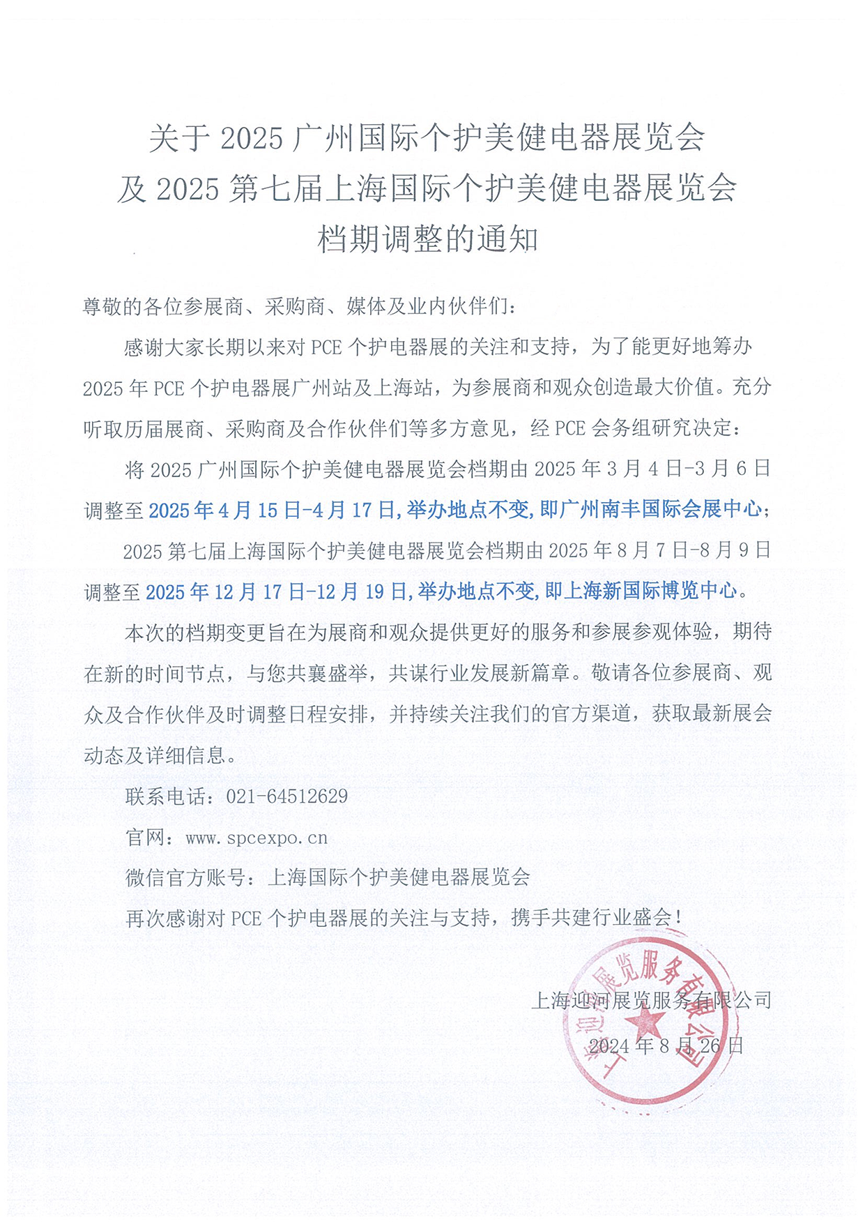 感謝大家長期以來對PCE個護(hù)電器展的關(guān)注和支持,為了能更好地籌辦2025年PCE個護(hù)電器展廣州站及上海站,為參展商和觀眾創(chuàng)造最大價值。充分聽取歷屆展商、采購商及合作伙伴們等多方意見,經(jīng)PCE會務(wù)組研究決定: