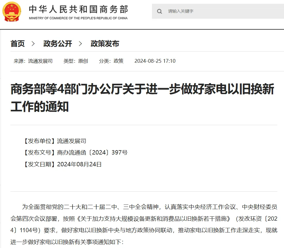 商務(wù)部辦公廳 國(guó)家發(fā)展改革委辦公廳 財(cái)政部辦公廳 市場(chǎng)監(jiān)管總局辦公廳 2024年8月24日 來(lái)源:商務(wù)部、e公司