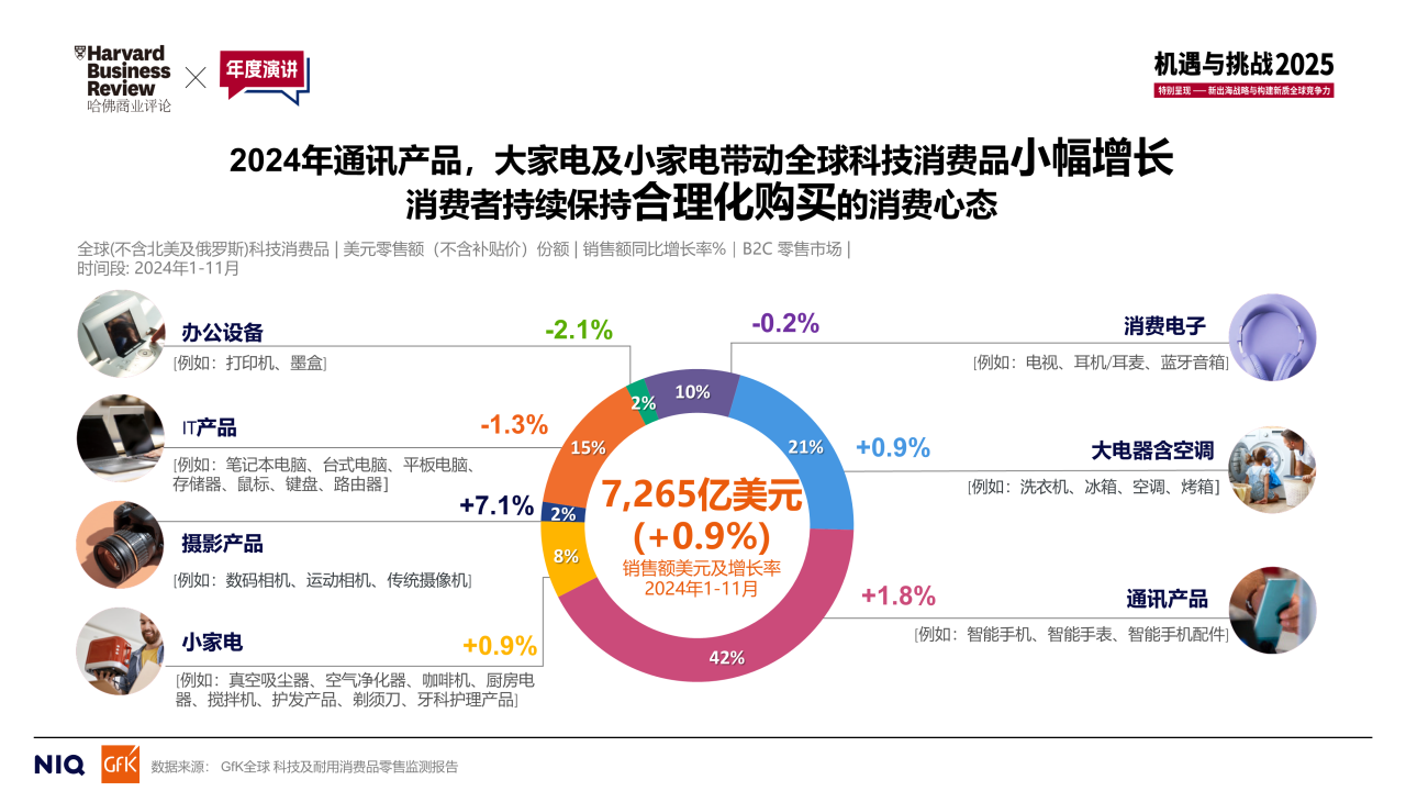 縱觀去年全年全球T&D市場的實際銷售表現(xiàn),尋找增長點的道路同樣充滿挑戰(zhàn),但同時也展現(xiàn)出穩(wěn)定的復蘇跡象,令人鼓舞。GfK全球市場監(jiān)測數(shù)據(jù)顯示,2024年1~11月,全球T&D市場(除北美、俄羅斯,以下同)銷售額達到7265億美元,同比增長0.9%。其中,通訊產(chǎn)品市場銷售額(在整體T&D市場中占比42%)同比增長近2%,為整個行業(yè)的增長提供了支撐。