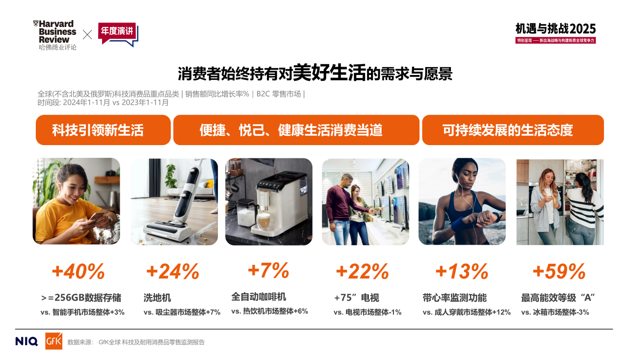 消費者側(cè),能夠引領(lǐng)新生活,符合便捷、悅己、健康生活的消費理念,響應可持續(xù)發(fā)展的生活態(tài)度的產(chǎn)品去年都交出了優(yōu)秀的答卷。例如,2024年1~11月,存儲容量大于等于256GB的智能手機銷售額同比增長40%,75吋以上的電視銷售額同比增長22%,A級能效的冰箱產(chǎn)品銷售額同比增長59%。