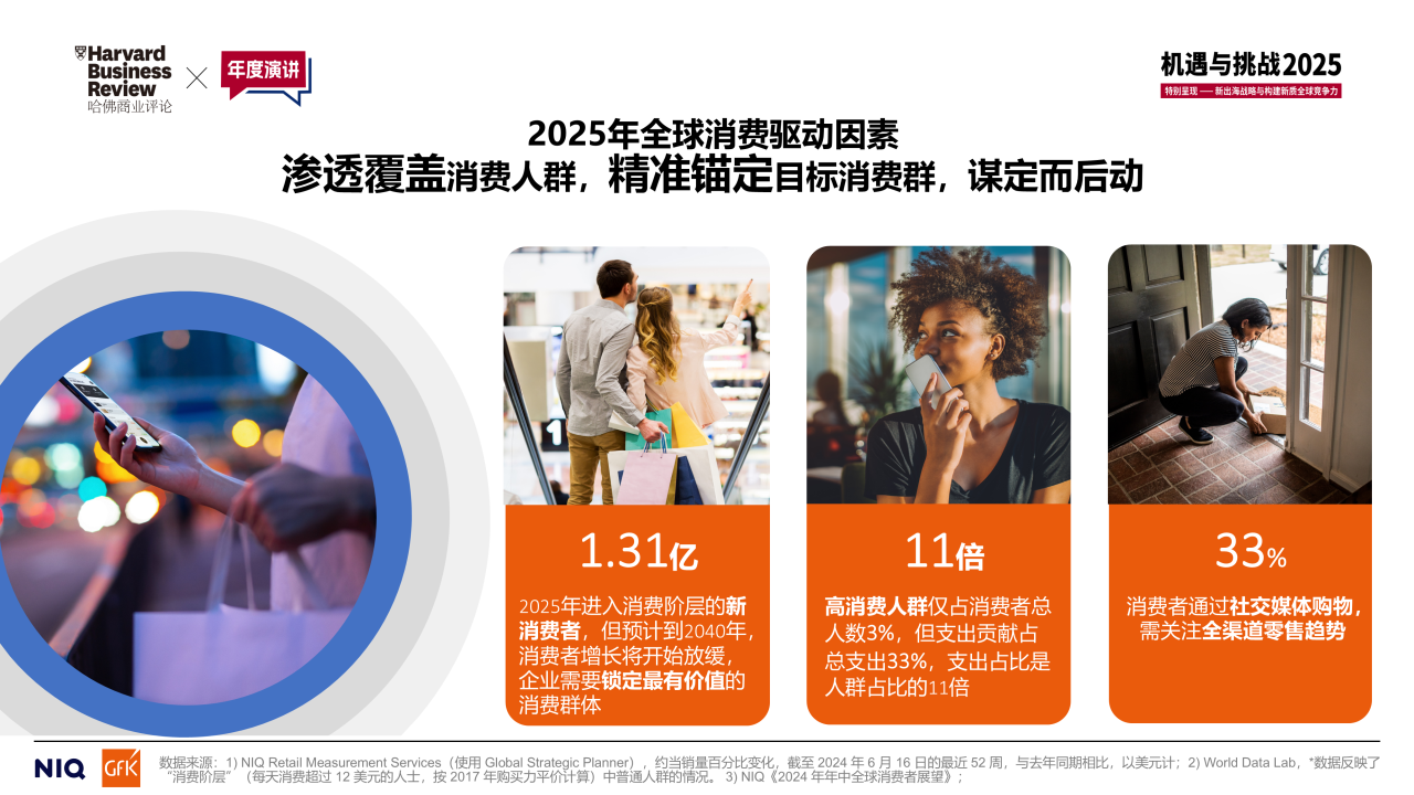 2025年,預計將有1.31億人進入消費階層,成為新消費者,這是一個巨大的增長機會。新增消費者主要來自于印度、中國和美國;其中,印度將有4700萬的新消費人群進入消費階層,中國約有3000萬,美國約有240萬。在全體消費者中,高消費人群僅占總?cè)藬?shù)的3%,但支出貢獻占比達到33%,因此,企業(yè)需要采取策略來吸引和服務這些高價值的消費者。值得注意的是,當前已有33%的消費者通過社交媒體購物,企業(yè)必須關(guān)注全渠道零售的發(fā)展,確保產(chǎn)品和服務能夠在消費者選擇的任何渠道中無縫對接,契合消費者的購物習慣,這是進一步釋放新興渠道增長潛力的關(guān)鍵。