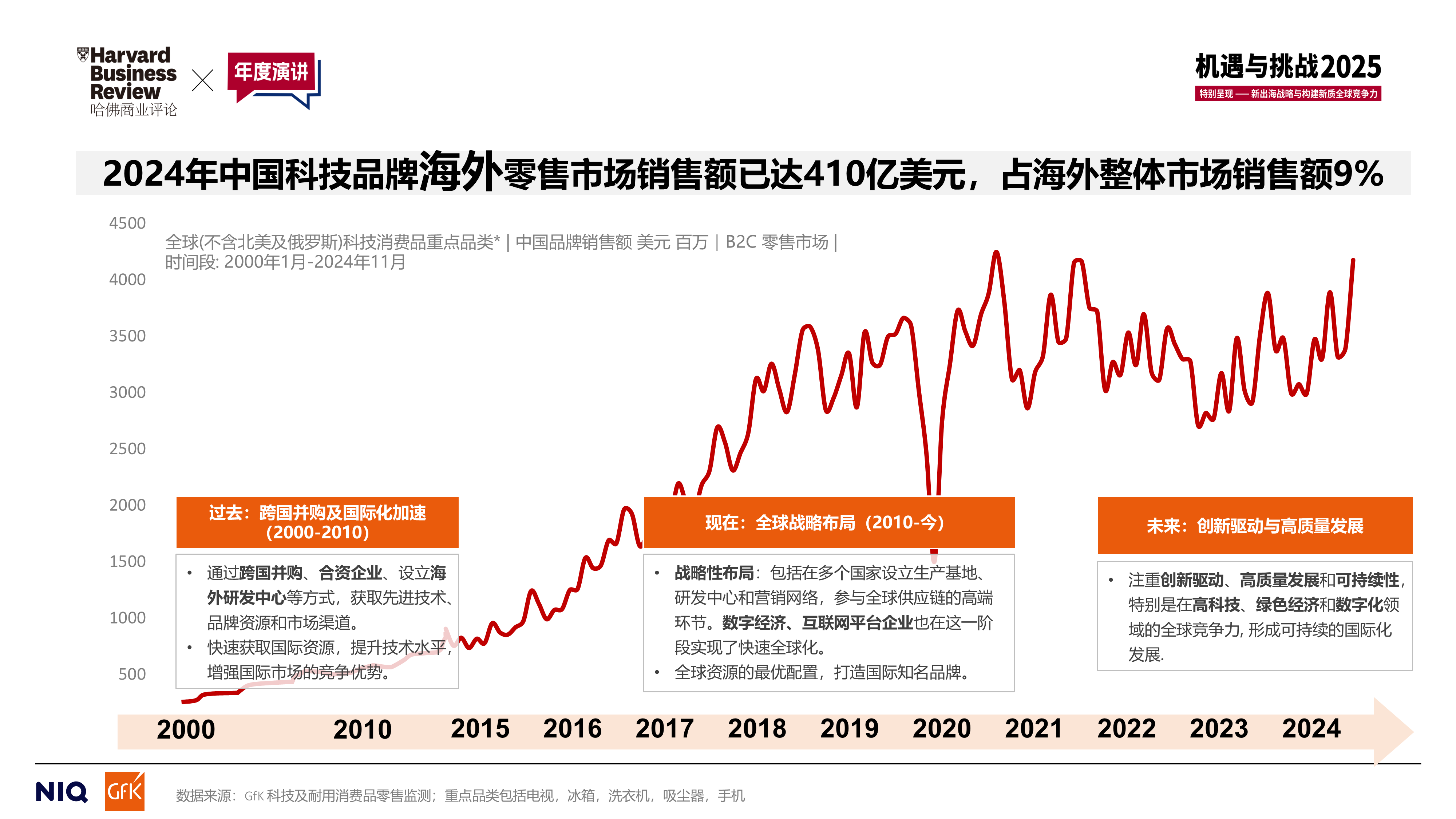 對于中國品牌來講,出海之路在過去的20年里可謂荊棘叢生,機遇與挑戰(zhàn)并存。過去中國品牌通過跨國并購、成立合資企業(yè)、設(shè)立海外研發(fā)中心等方式,快速獲取國際資源;贕fK過往的零售監(jiān)測數(shù)據(jù)可見,中國品牌在海外市場份額逐步崛起是自2015年開始,F(xiàn)在中國品牌在全球戰(zhàn)略布局中,更要注重全球資源的最優(yōu)配置,打造國際知名品牌認知與形象。