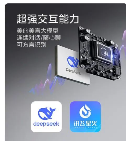 除了與AI能力直接相關(guān)的軟件行業(yè)陸續(xù)接入DeepSeek外,這種趨勢甚至蔓延到空調(diào)、電視、掃地機(jī)器人等硬件設(shè)備上。對于過去5年來“壓力山大”的家電企業(yè)來說,焦慮會更加嚴(yán)重:很多企業(yè)都在產(chǎn)品中爭相接入DeepSeek,以避免錯過時代的浪潮: 近日,美的空調(diào)宣布推出首款DeepSeek空調(diào),旗下鮮凈感空氣機(jī)T6接入DeepSeek R1滿血版。 美的宣傳稱,Deepseek深度學(xué)習(xí)推理思考邏輯可視化,能夠溫濕風(fēng)自感知自調(diào)節(jié);同時,DeepSeek實(shí)現(xiàn)一句話多指令多意圖理解,模糊指令意圖理解。