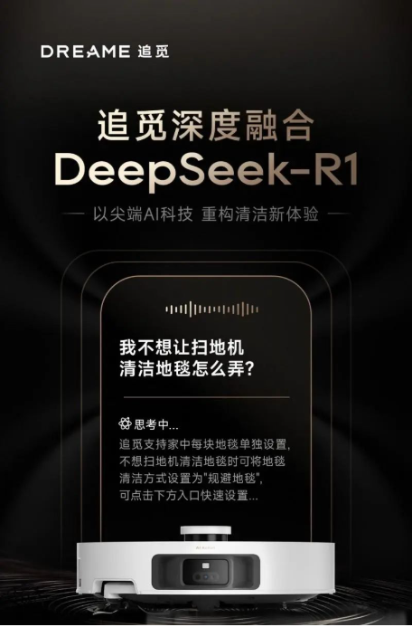 追覓科技宣布旗下Dreamehome APP已接入DeepSeek-R1大模型,并且追覓S50系列掃地機(jī)器人也將成為首款搭載DeepSeek R1的智能清潔產(chǎn)品。 接入DeepSeek后,追覓S50系列掃地機(jī)器人能夠主動學(xué)習(xí)用戶習(xí)慣、智能規(guī)劃清潔路徑、提供更自然流暢的語音交互。