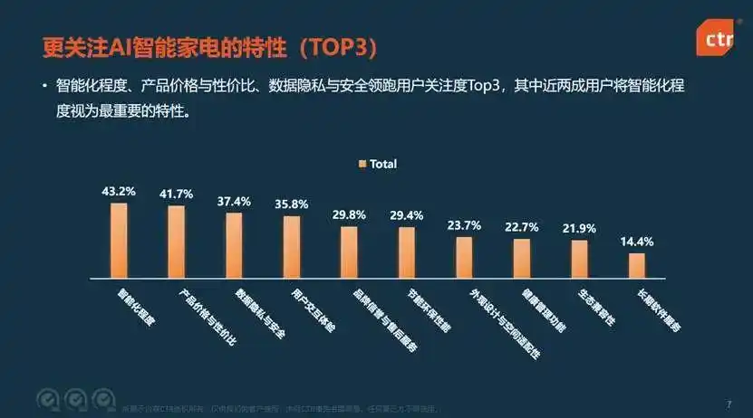 科技與實用主義并行:AI智能家電迎來消費新機遇在AI技術的強勁推動下,各大品牌正積極進軍智能家電領域,紛紛接入DeepSeek平臺,成功實現(xiàn)了從“功能執(zhí)行”到“決策智能”的重大跨越。冰箱因此進化成為健康管理中心,空調也升級為環(huán)境健康的中樞。海爾推出的“智慧家庭home GPT”、方太的“Healthy Cooking GPT”等產品,便是這一趨勢的生動例證。與此同時,多模態(tài)交互方式已成為行業(yè)主流,其中,語音+視覺+手勢控制的結合尤為突出。全球領先的智能家居品牌Aqara近期推出多款AI新品,包括支持語音、手勢多重交互的智能中控屏,以及可自主學習用戶習慣的溫濕度調節(jié)系統(tǒng)。通過融合多模態(tài)感知技術,Aqara的產品極大地簡化了用戶操作,重新界定了人與智能設備之間的交互體驗。 CTR調查結果顯示,AI智能家電用戶需求呈現(xiàn)“科技價值”與“實用主義”雙軌并行特征:智能化程度、產品價格與性價比、數據隱私與安全領跑用戶關注度Top3。 其中近兩成用戶(17.7%)將智能化程度視為最重要的特性。按不同城市線級來看,一線及新一線用戶更聚焦智能化程度(18.9%)、交互體驗(13.8%),印證其對技術迭代與場景創(chuàng)新的高敏感度;二線城市用戶價格敏感度突出(24.2%),三線及以下城市用戶對隱私安全訴求突出(15.5%),折射出對“技術普惠”的強烈期待。智能家電行業(yè)需構建“高端技術突破+大眾化產品下沉”雙引擎,以差異化策略激活全域消費潛力。