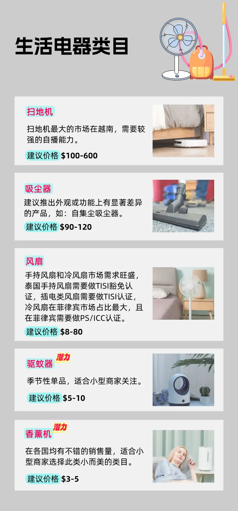 在市場(chǎng)細(xì)分方面,個(gè)護(hù)電器如吹風(fēng)機(jī)、卷直發(fā)器、按摩儀等市場(chǎng)需求尤為旺盛,特別是在追求時(shí)尚與健康的年輕消費(fèi)者群體中;而家電類產(chǎn)品如掃地機(jī)、吸塵器、風(fēng)扇等,雖然單件產(chǎn)品的客單價(jià)相對(duì)較低,但由于其廣泛的應(yīng)用場(chǎng)景和龐大的消費(fèi)群體,整體市場(chǎng)規(guī)模依然巨大,展現(xiàn)出了強(qiáng)勁的市場(chǎng)競(jìng)爭(zhēng)力。
