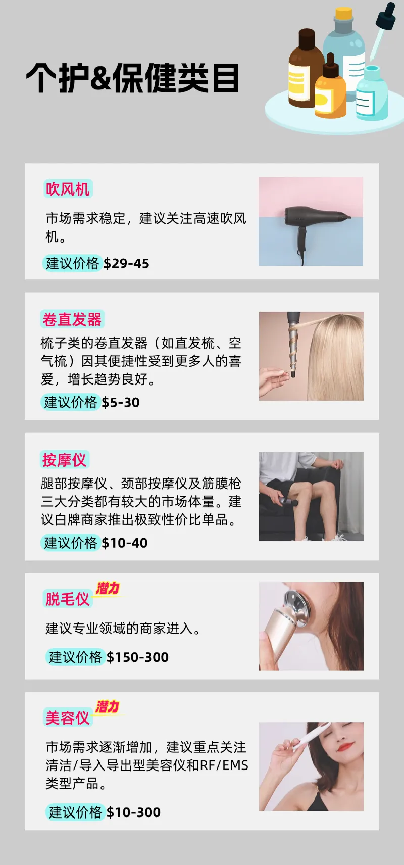 基于以上市場(chǎng)需求洞察,以下是一些具有潛力的產(chǎn)品推薦,供跨境電商賣家參考: