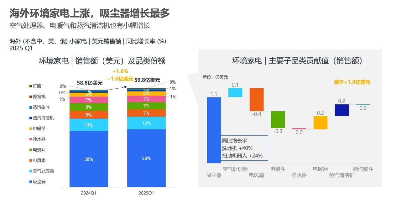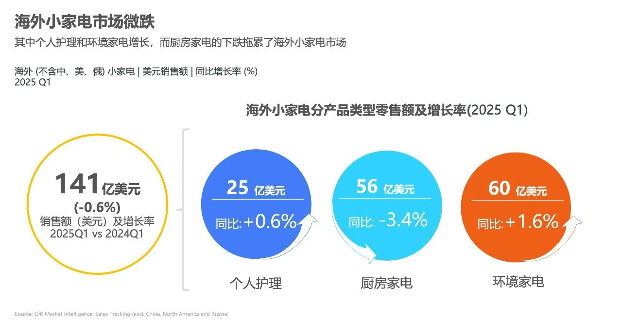 海外小家電市場(chǎng)一季度銷售額141億美元,同比微跌0.6%。其中,個(gè)人護(hù)理和環(huán)境家電呈增長(zhǎng)態(tài)勢(shì),銷售額分別為25億美元、60億美元,同比分別增長(zhǎng)0.6%、1.6%;廚房家電市場(chǎng)銷售額56億美元,同比下跌3.4%,因此拖累了海外小家電市場(chǎng)的整體表現(xiàn)。