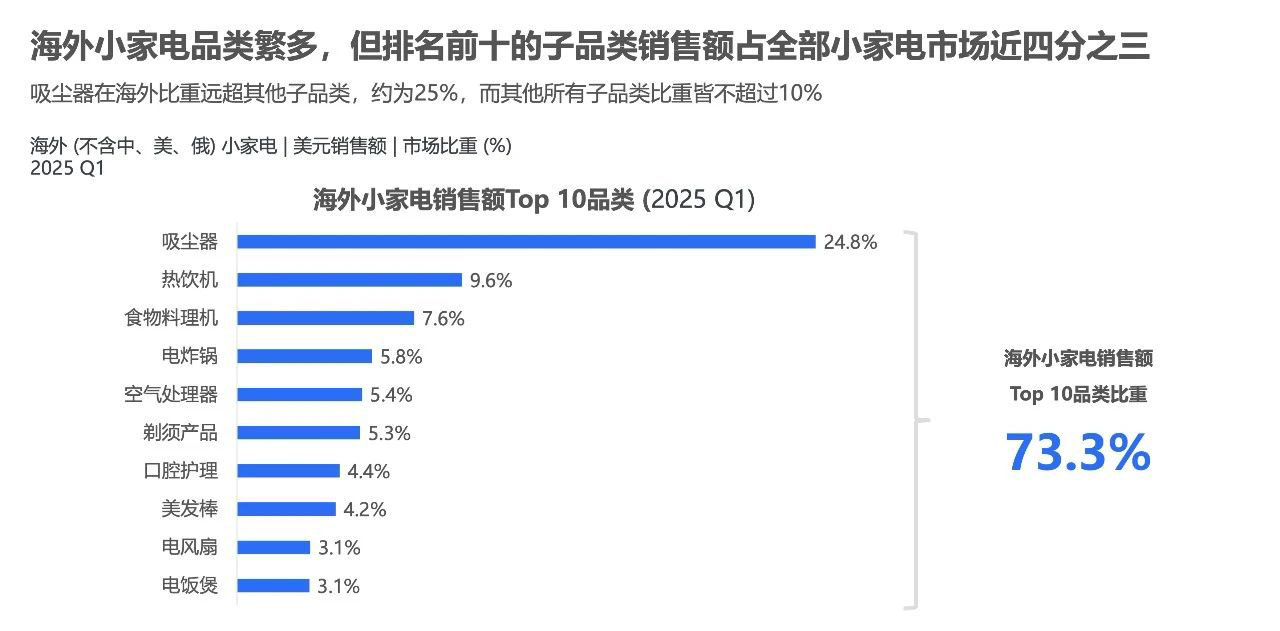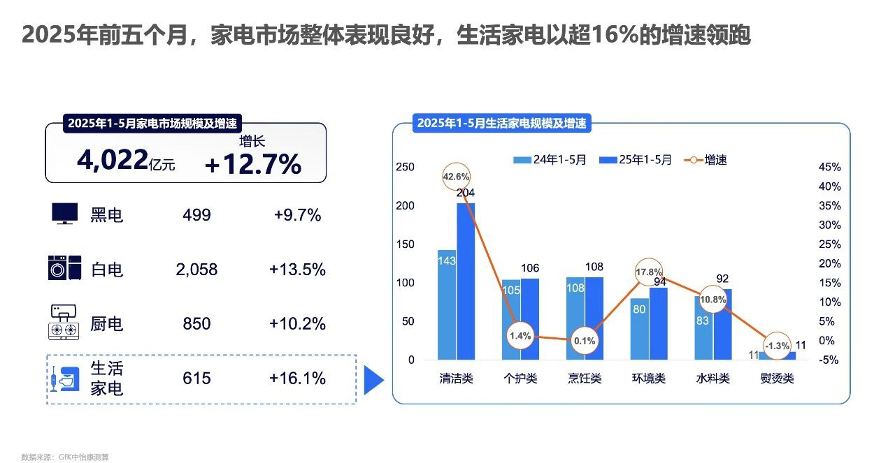 報(bào)告指出,海外小家電市場(chǎng)今年一季度整體微跌。中國(guó)在向內(nèi)擴(kuò)容消費(fèi),向外多元布局之下,今年前五個(gè)月家電市場(chǎng)整體表現(xiàn)良好,銷售額達(dá)到4022億元,同比增長(zhǎng)12.7%。生活家電以615億元的規(guī)模,超過(guò)16%的同比增速領(lǐng)跑,并呈現(xiàn)四大發(fā)展趨勢(shì)。