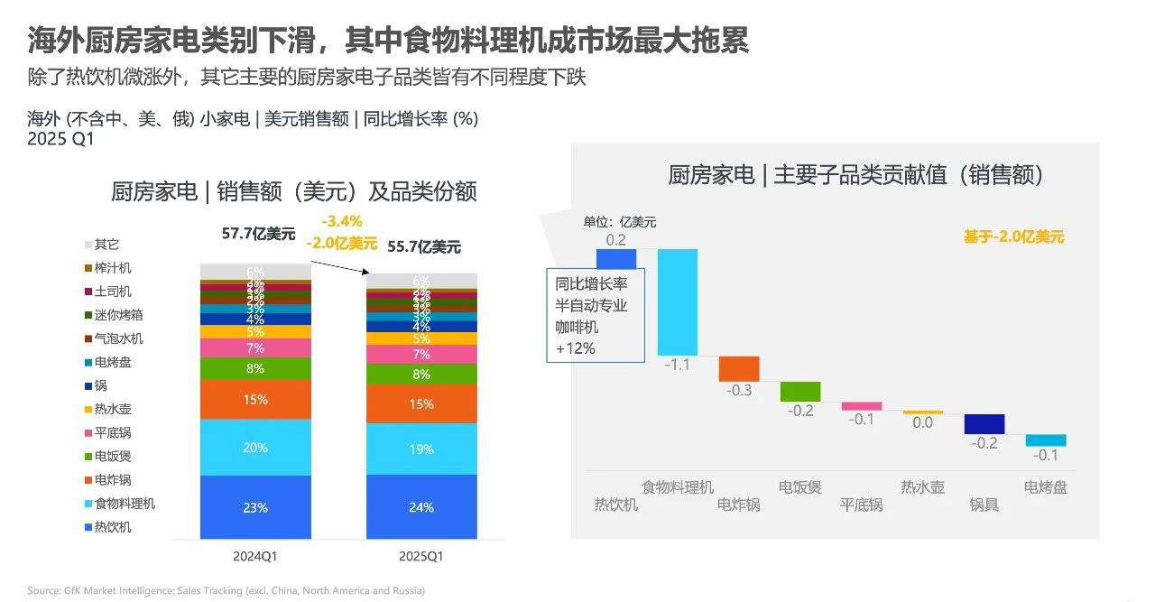 海外廚房家電市場(chǎng)出現(xiàn)下滑,今年一季度銷售額55.7億美元,同比下降3.4%。除了熱飲機(jī)銷售額同比微漲0.2%以外,其它主要廚房家電子品類皆有不同程度下跌,其中食物料理機(jī)成市場(chǎng)最大拖累。整體來(lái)看,小家電市場(chǎng)中那些精準(zhǔn)瞄準(zhǔn)增長(zhǎng)領(lǐng)域的挑戰(zhàn)者品牌,成功實(shí)現(xiàn)了最大程度的擴(kuò)張,并進(jìn)一步延伸至新的產(chǎn)品細(xì)分領(lǐng)域或品類。