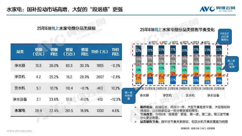 水家電 水家電整體:在凈水器、凈飲機(jī)等均價(jià)較高品類的強(qiáng)勁帶動(dòng)下,2025年618期間水家電行業(yè)迎來全面增長,銷量、銷售額與產(chǎn)品均價(jià)均實(shí)現(xiàn)顯著提升。從細(xì)分品類來看,凈水器低端產(chǎn)品憑借不斷增強(qiáng)的產(chǎn)品競爭力,有效激發(fā)了市場需求;凈飲機(jī)與飲水機(jī)的增長則主要得益于消費(fèi)者對(duì)制冰功能的旺盛需求。在大促節(jié)奏方面,今年618大促的活動(dòng)周期進(jìn)一步拉長,自5月中上旬便已啟動(dòng),分階段的促銷模式使活動(dòng)節(jié)奏更趨平緩,三波促銷之間設(shè)置的緩沖期,為消費(fèi)者提供了更充裕的決策時(shí)間。