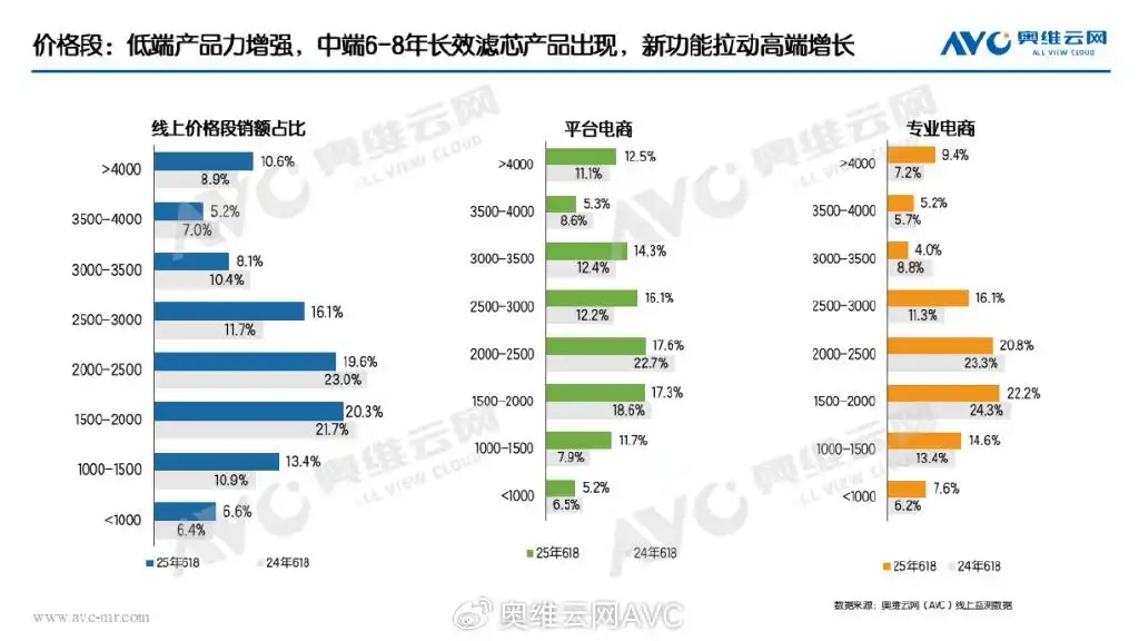 在國家補(bǔ)貼政策的有力推動(dòng)下,凈水器在2025年618開門紅階段便呈現(xiàn)出量額雙增的良好態(tài)勢(shì)。從價(jià)格段分析,1500元價(jià)位段產(chǎn)品市場份額快速擴(kuò)張,基礎(chǔ)款凈水器市場競爭愈發(fā)激烈,行業(yè)加速邁入“1元1G”時(shí)代(即每獲得1G制水量的成本約為1元)。主銷中端市場產(chǎn)品升級(jí)步伐加快,6-8年長效濾芯逐步成為標(biāo)配,富含礦物質(zhì)、純/凈分離龍頭等聚焦健康屬性的功能產(chǎn)品市場份額持續(xù)提升。高端市場中,頭部品牌不斷強(qiáng)化產(chǎn)品功能配置,行業(yè)“頂配”機(jī)型市場份額穩(wěn)步上揚(yáng)。