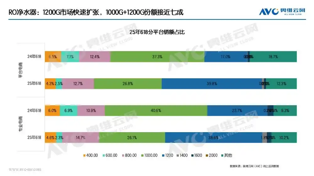 細(xì)分來看,純水機(jī)通量呈現(xiàn)持續(xù)增長趨勢(shì)。目前,1000G和1200G通量的主流產(chǎn)品占比接近70%,而1400G、1600G等更大通量產(chǎn)品的市場份額也在穩(wěn)步提升,滿足消費(fèi)者對(duì)更快制水速度、更大出水量的需求。