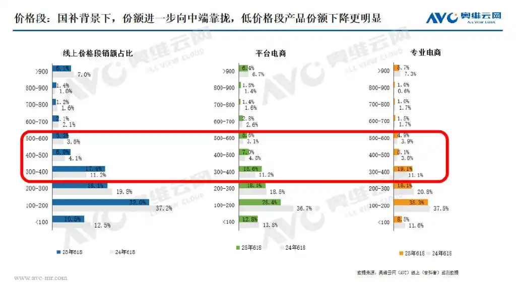 價(jià)格段:線上高端市場增長放緩,新需求持續(xù)向兩端擴(kuò)展