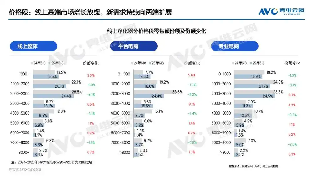 奧維云網(wǎng)(AVC)監(jiān)測數(shù)據(jù)顯示,線上市場618大促期間價(jià)格格局呈現(xiàn)結(jié)構(gòu)性變化,呈現(xiàn)"中端發(fā)力、兩端趨緩"的顯著特征。具體來看,1000元以下入門價(jià)位段零售額份額同比微增2.3%,高端市場(5000元+)僅增長0.4%,而3000-4000元中端價(jià)位段表現(xiàn)最為突出,份額同比大幅提升6.5%,成為驅(qū)動(dòng)市場增長的核心力量。該價(jià)格段的強(qiáng)勢(shì)表現(xiàn)主要得益于參數(shù)升級(jí)需求與寵物凈化新需求的雙重推動(dòng):一方面,寵物凈化器產(chǎn)品持續(xù)更新迭代,持續(xù)拉動(dòng)3000元以上的中高端市場增長;另一方面,高性價(jià)比產(chǎn)品逐步向上擴(kuò)展,成功切入這一價(jià)格帶,進(jìn)一步擠壓高端產(chǎn)品的份額。