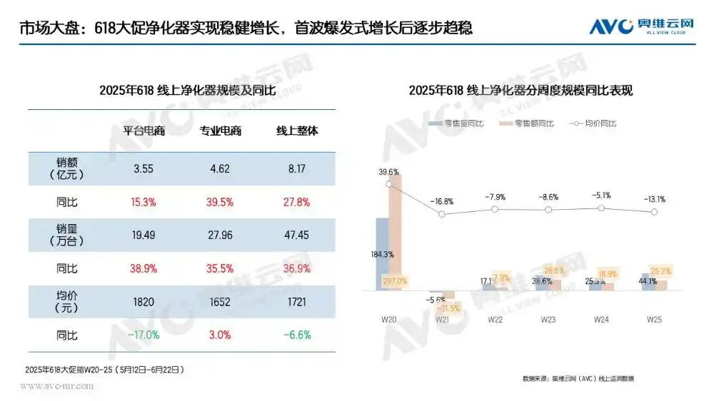 奧維云網(wǎng)(AVC)監(jiān)測數(shù)據(jù)顯示,線上市場618大促期間凈化器零售額8.17億元,同比增長27.8%,零售量47.45萬臺(tái),同比增長36.9%,增速均顯著高于一季度26.5%和21.2%的水平。值得注意的是,在銷售規(guī)?焖贁U(kuò)張的同時(shí),行業(yè)均價(jià)同比下滑6.6%,這主要?dú)w因于高性價(jià)比機(jī)型主導(dǎo)市場。從促銷節(jié)奏來看,由于2024年第20周尚未啟動(dòng)大促活動(dòng),今年首周呈現(xiàn)爆發(fā)式增長特征,而隨著促銷活動(dòng)持續(xù)開展,第21-25周增速逐步回歸常態(tài),整體呈現(xiàn)前高后低的走勢(shì)。